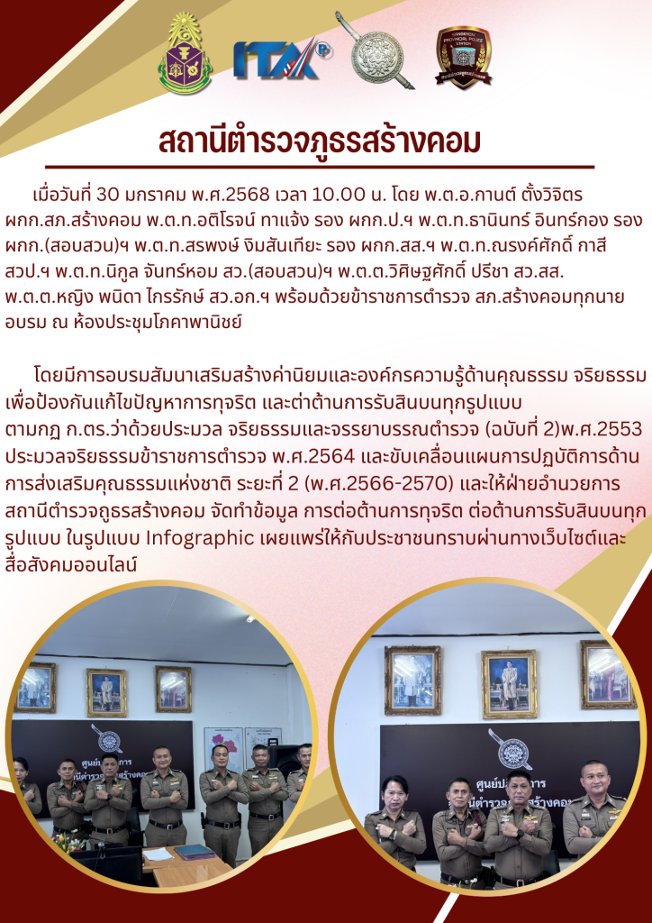 เมื่อวันที่ 17 มกราคม พ.ศ.2568 เวลา 08.00 น. พ.ต.อ.กานต์ ตั้งวิจิตร ผกก.สภ.สร้างคอม พร้อมด้วยข้าราชก